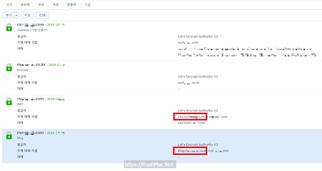 [시놀로지] 개인 도메인 인증서(ssh)등록 방법<let's encrypt편=""></let's>