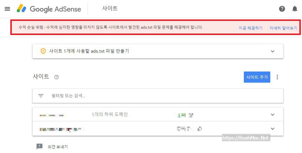 "수익 손실 위험 - 수익에 심각한 영향을 미치지 않도록 사이트에서 발견된 ads.txt 파일 문제를 해결해야 합니다." 상단에 경고 메시지가 뜨는 이유는 티스토리에 연결된 개인 도메인 때문인 것 같습니다.