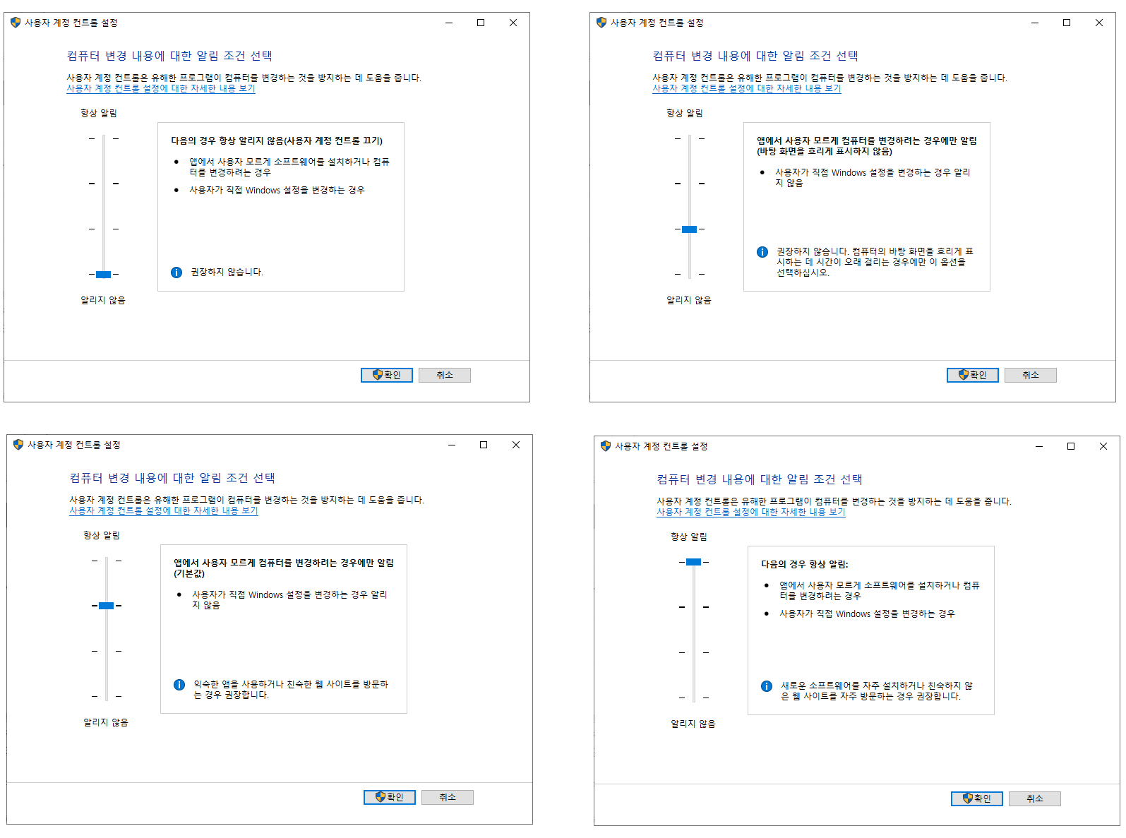 사용자 계정 컨트롤 4가지 옵션 기능이 있습니다.