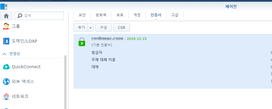 4. DSM > 제어판 > DSM 설정 > 인증서 > 인증서 생성