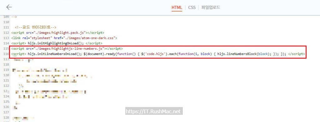 highlightjs-line-numbers.js 파일 대해 티스토리 기준(스킨편집] -> [파일업로드]) 업로드 합니다.