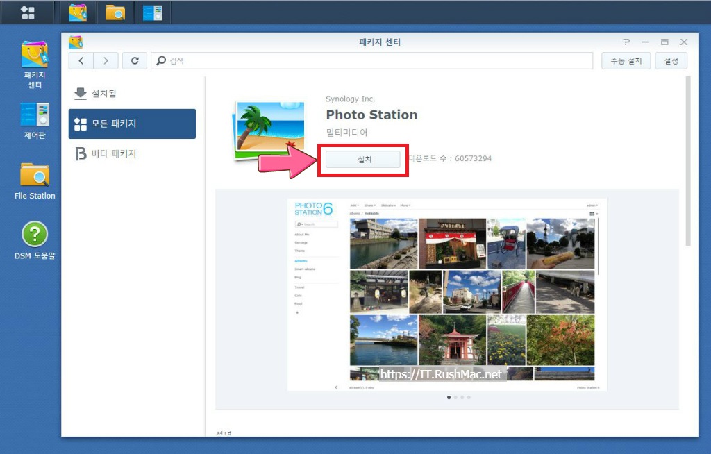 - 시놀로지의 Disk Station에 접속한 후 패키지센터 실행 후 Photo Station 설치 합니다.