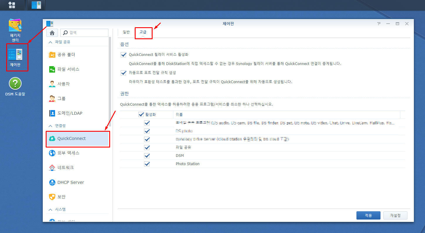 - 제어판 > 퀵커넥트 -> [고급]탭으로 이동합니다.