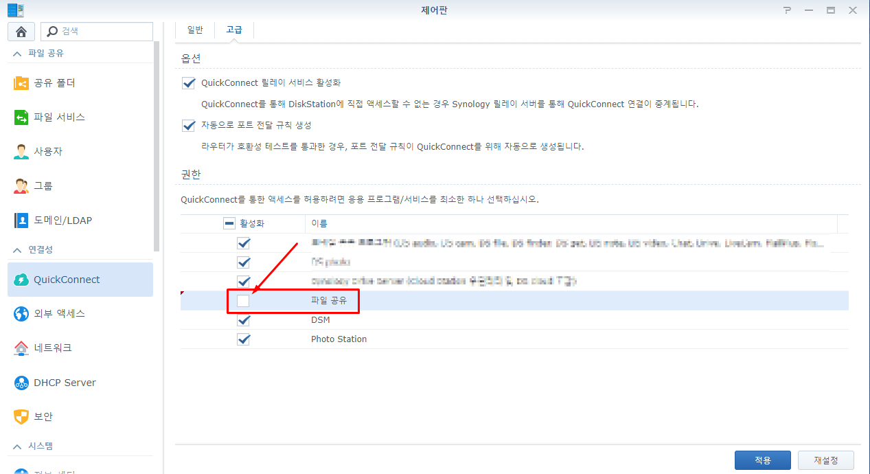 - [고급] 권한에서 파일공유 체크박스 해제합니다.